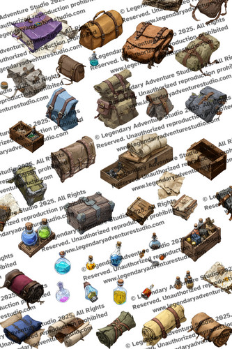 This detailed pack includes everything from travel packs and potions to maps, scrolls, and supply crates — perfect for cluttering dungeons, outfitting NPCs, or building treasure hoards.