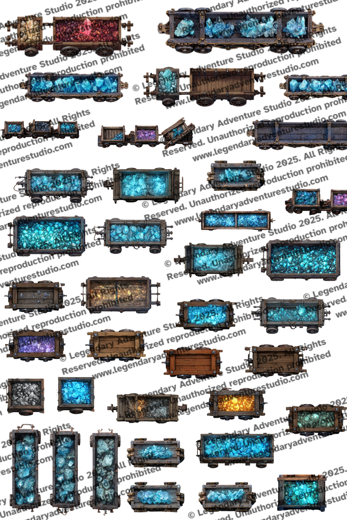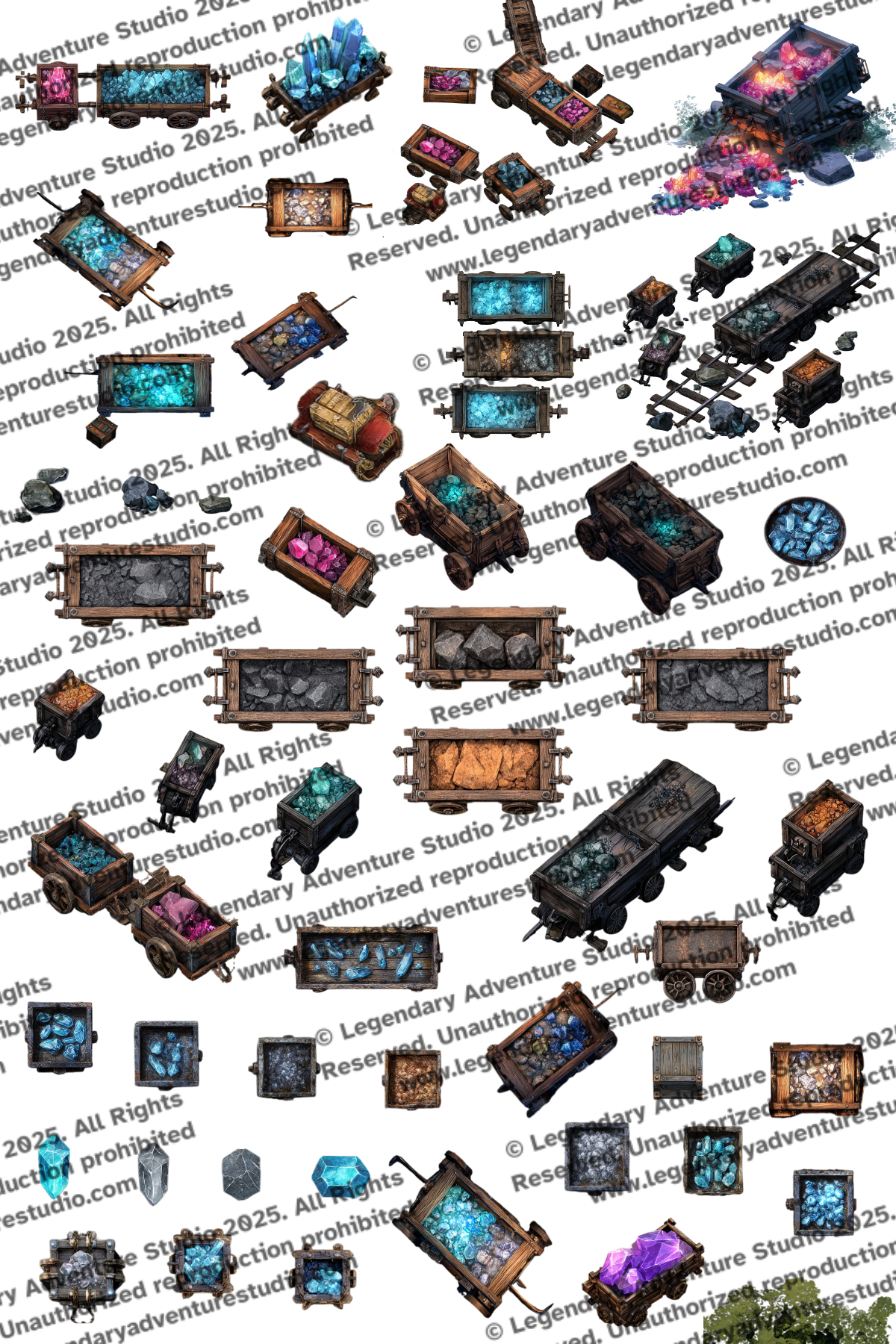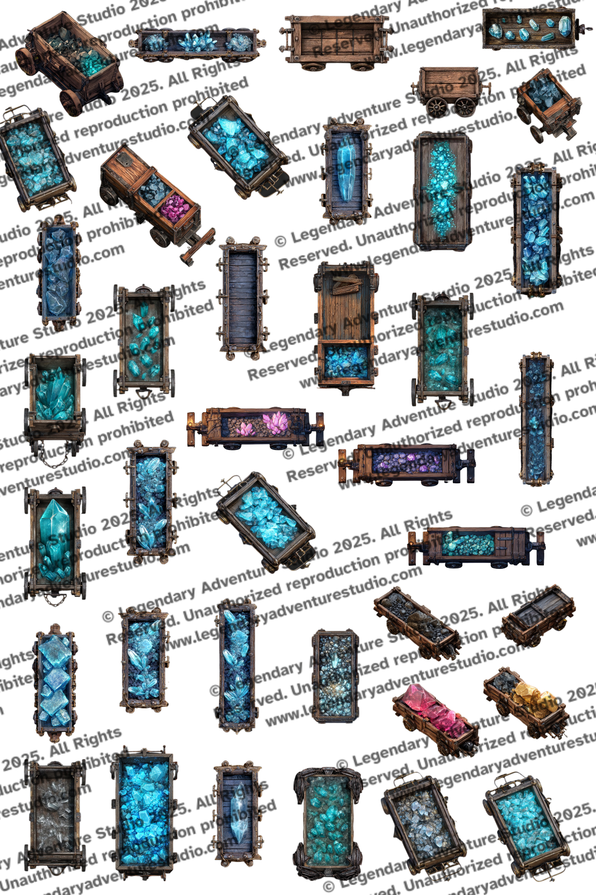 - Mining Carts: filled and empty carts, ore mounds, mixed gems, crystal hauls, wooden mining frames, and unique magical tanks