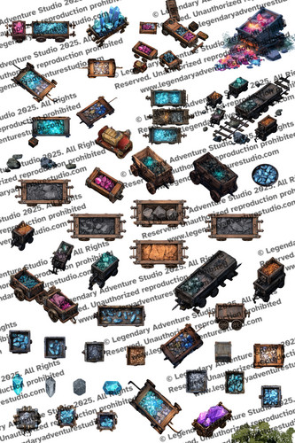 125+ hand-crafted, cave-ready crystal and mining cart assets for fantasy maps. Designed in top-down perspective and optimized for DungeonDraft or VTT use, this pack brings your caverns, tunnels, and mines to life with glowing geodes, magical ore carts, and ambient props.